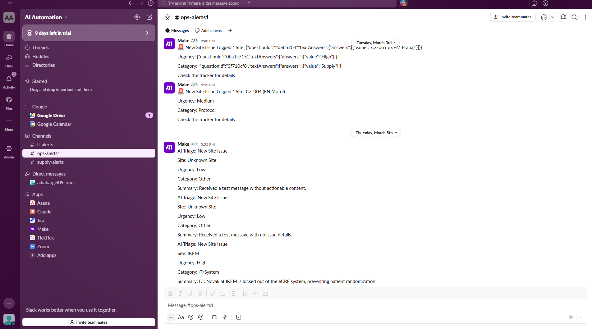 Site issues submitted via Google Form are automatically formatted by Make and posted as structured alerts to a dedicated Slack channel.